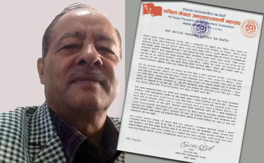 महासंघका अध्यक्ष टिका कडेलले बुधवार विज्ञप्ति जारी गरी स्वास्थ्य क्षेत्रका विकृति नरोकिए कडा संघर्ष गर्ने चेतावनी समेत दिएका छन् ।