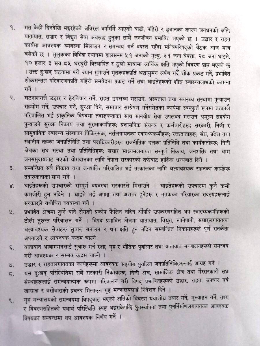 आइतबार बसेको मन्त्रिपरिषदको बैठकले बाढी, पहिरो र डुबान पीडितहरुको राहत, उद्दार र उपचारका लागि आवश्यक व्यवस्था मिलाउने निर्णय गरेको हो ।