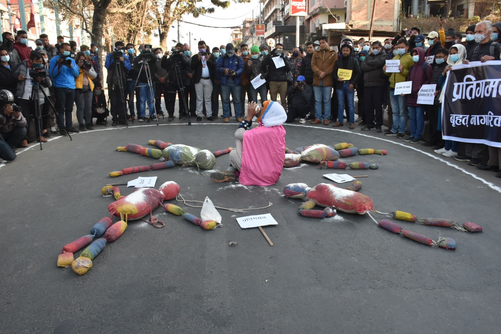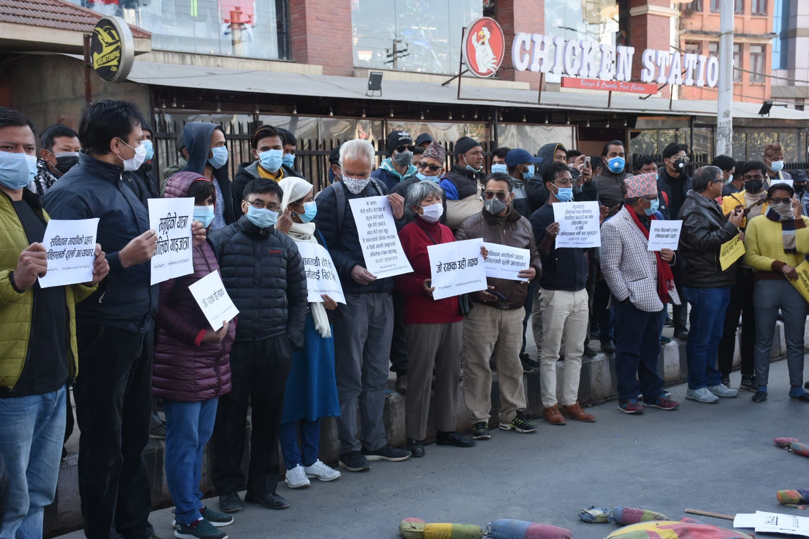 काठमाडौं । प्रधानमन्त्री केपी शर्मा ओलीले प्रतिनिधिसभा बिघटन गराएपछि विभिन्न क्षेत्रबाट यसको विरोध भइरहेको छ । आज नागरिक समाजले पनि राजधानीमा धनाई दिएको छ । नागरिक समाजले ओलीको कदमलाई प्रतिगमनकारी भनी धर्ना दिएको छ । धर्नामा ओलीको कदमविरोधी ब्यानरहरुसहित नागरिक समाजका व्यक्तिहरु सहभागी थिए ।
