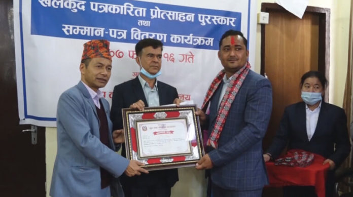 काठमाडौं । युवा तथा खेलकुद मन्त्रालयले ९ जना पत्रकारलाई सम्मान गरेको छ । मन्त्रालयमा आइतबार आयोजित एक कार्यक्रमका बीच युवा तथा खेलकुदमन्त्री दावा तामाङले पत्रकारहरुलाई सम्मान गरेका हुन् । मन्त्रालयको बार्षिक कार्यक्रम अनुसार खेलकुद पत्रकारिता पुरस्कारबाट कमल खत्री सम्मानित भए । नागरिक दैनिक पश्चिेमी संस्करणमा रहेका कमलले नगद ५० हजार प्राप्त गरेका छन् । यसैगरी महिला तर्फ राष्ट्रिय समाचार समितिमा कार्यरत मुना कार्की सम्मानित भइन् ।