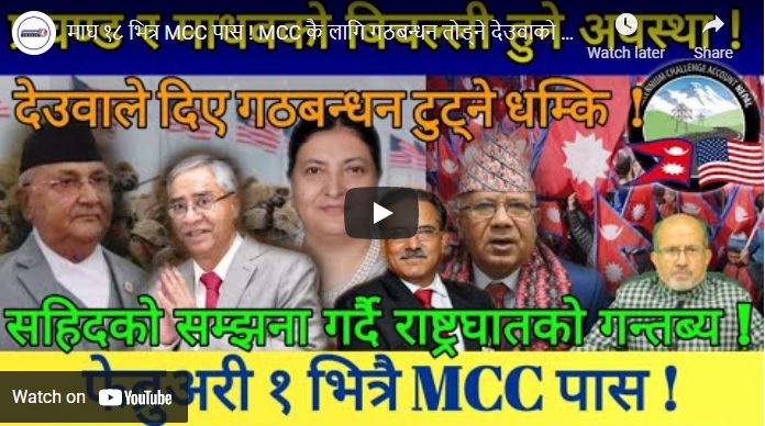 Videoराजनीति समाचार माघ १८ भित्र MCC पास ! MCC कै लागि गठबन्धन तोड्ने देउवाको धम्कि,प्रचण्डलाई सहिद बन्ने डर !-AJ January 31, 2022 160 Facebook Twitter Google+ Pinterest WhatsApp Share this: Share on X (Opens in new window) X Share on Facebook (Opens in new window) Facebook