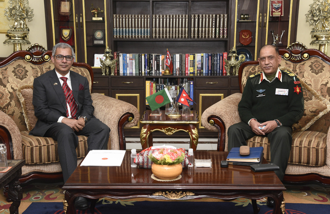 काठमाडौं । नेपाली सेनाका प्रधानसेनापति प्रभुराम शर्मासित नेपालका लागि बंगलादेशका राजदूत सल्लाहुदिन नोमन चौधरीले शिष्टाचार भेटवार्ता गरेका छन् । बुधबार प्रधानसेनापति शर्माको कार्यकक्षमा भएको भेटवार्तामा दुईपक्षीय आपसी हित तथा पारस्परिक सम्बन्धका विषयमा छलफल भएको थियो ।