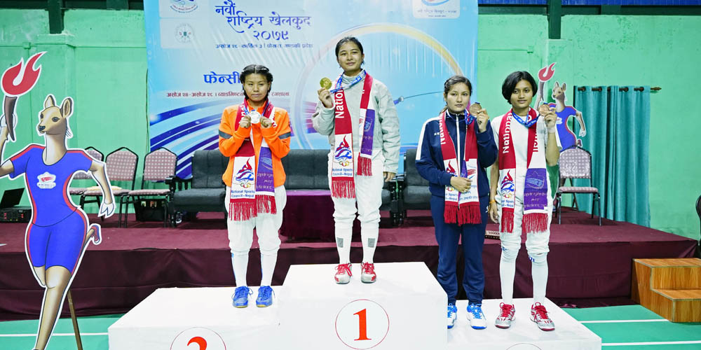 नेपाल आर्मीका रविना थापा र आर्मीकै मनीषा तेस्रो स्थान रहँदै कांस्यपदकमा चित्त बुझाउनु पर्याे । साे प्रतियोगिता ईपी, फोयल र सेबर इभेण्टमा व्यक्तिगत र टिम इभेण्टमा प्रतिस्पर्धामा गर्नेछन् । प्रतियोगितामा दुई विभागीयसहित ६ टिमको सहभागिता रहेको छ । जसमा नेपाली आर्मी, सशस्त्र प्रहरी बलसहित गण्डकी प्रदेश, बागमती प्रदेश, प्रदेश नम्बर १ र सुदूरपश्चिम प्रदेशको सहभागीता रहेकाे छ ।