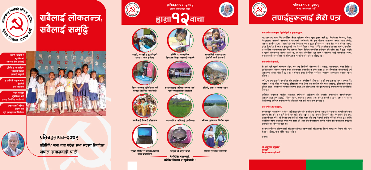 काठमाडौं । डा.  बाबुराम भट्टराई नेतृत्वको नेपाल समाजवादी पार्टी (नेसपा)ले मंसिर ४ मा हुने संघीय चुनावको लागि प्रतिवद्धतापत्र सार्वजनिक गरेको छ। प्रतिनिधिसभा र प्रदेशसभा निर्वाचनमा नेकपा माओवादी केन्द्रको चुनाव चिन्हबाट उम्मेदवारी दिएको नेसपाले चुनावी प्रतिवद्धतापत्र भने छुट्टै निकालेको हो ।