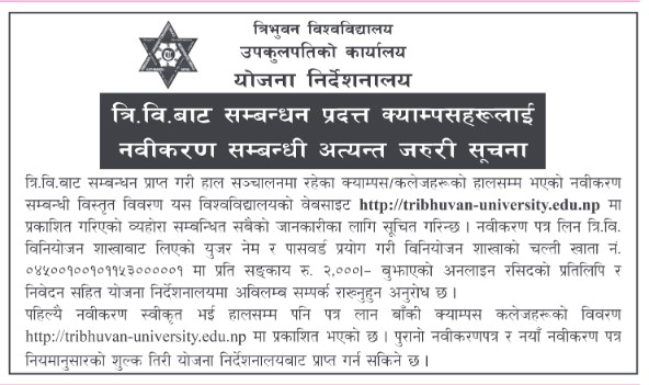त्रिवि उपकुलपतिको कार्यालय योजना निर्देशनालयले सार्वजनिक सूचना जारी गरेर सम्बन्धन प्रदत्त क्याम्पसलाई नवीकरण भएको पत्र लैजान भनेको हो।