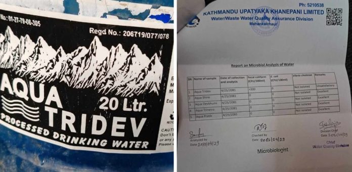 नमुना परीक्षणबाट मंगलबार रिपोर्ट प्राप्त भएको थियो । रिपोर्टमा एक्वा त्रिदेव ब्रान्डको पानीमा फिकल कोलिफर्म भेटिएको पाइएको हो ।