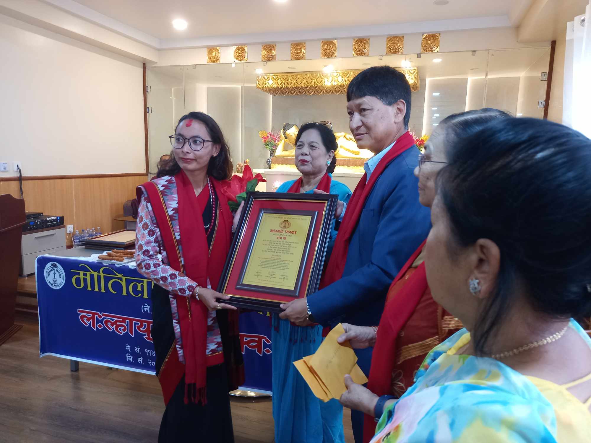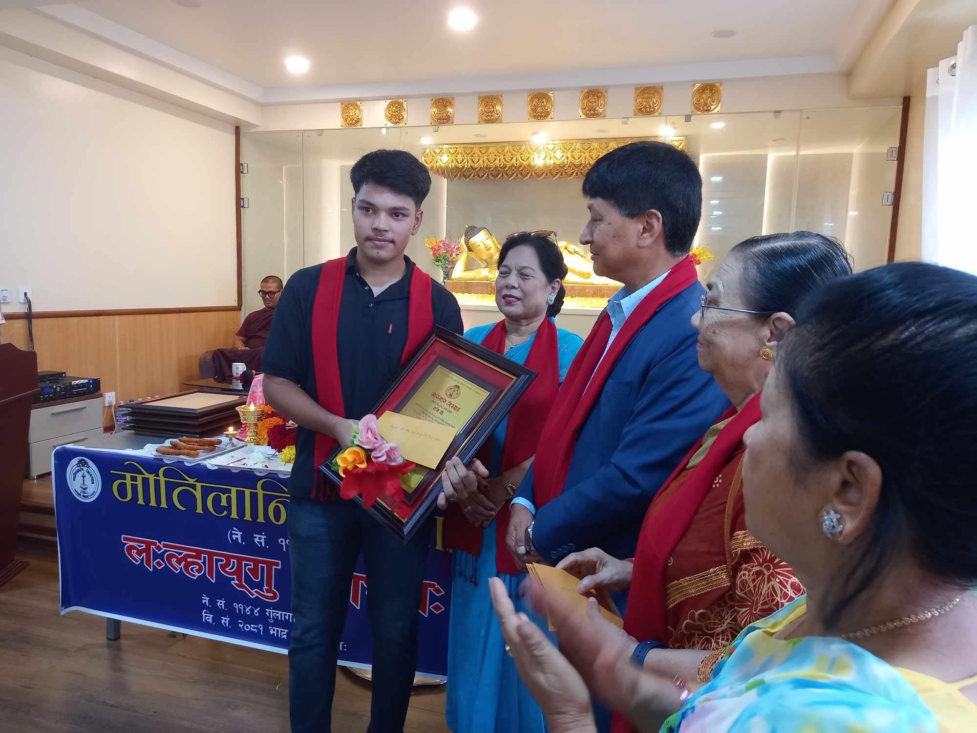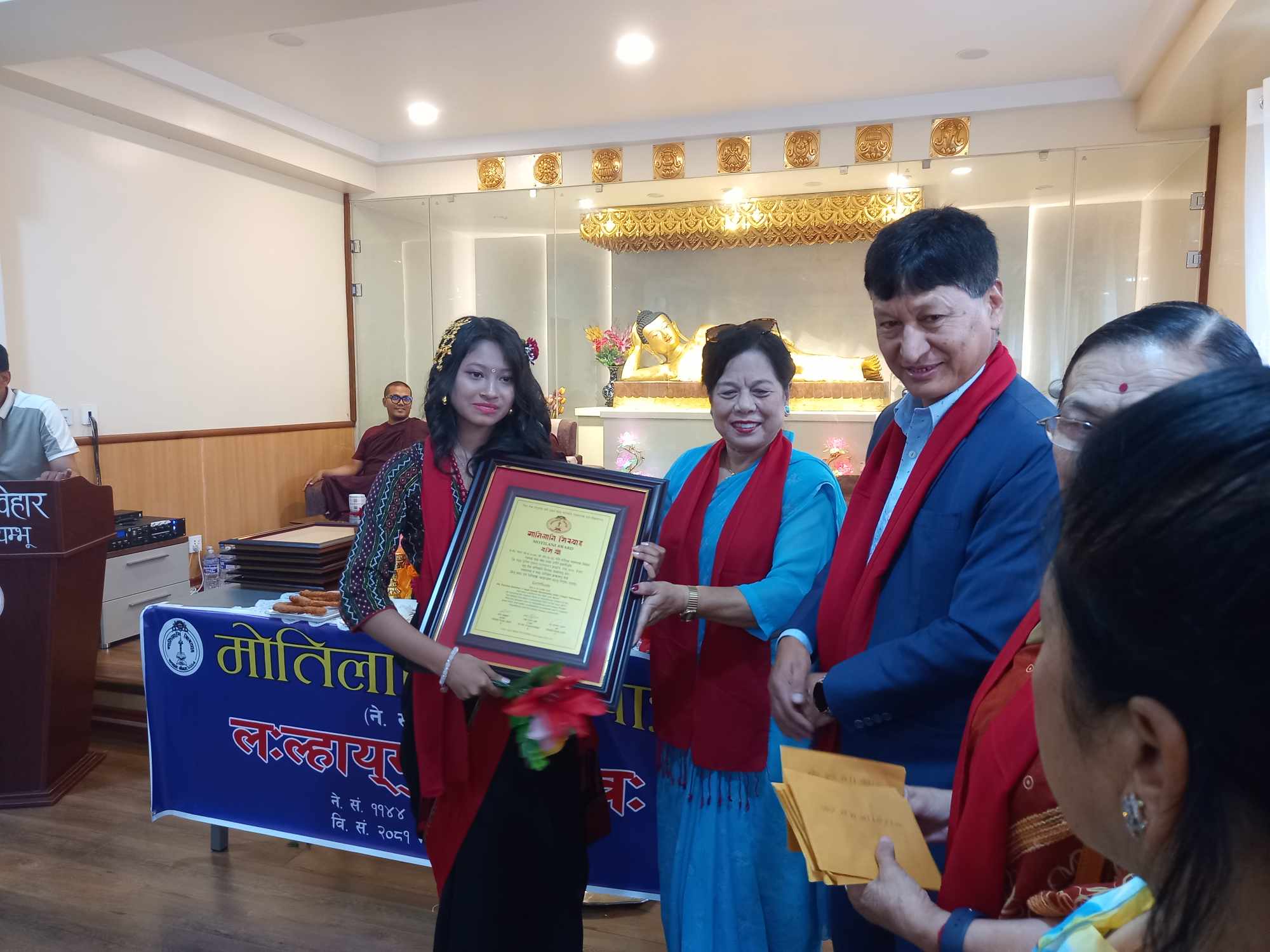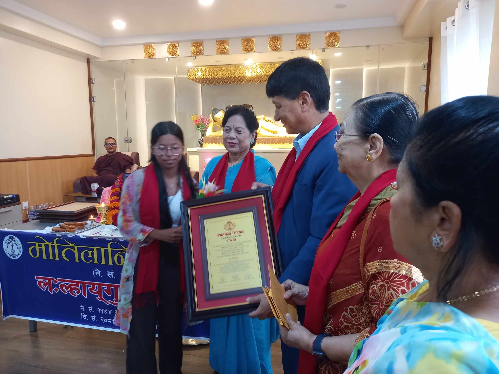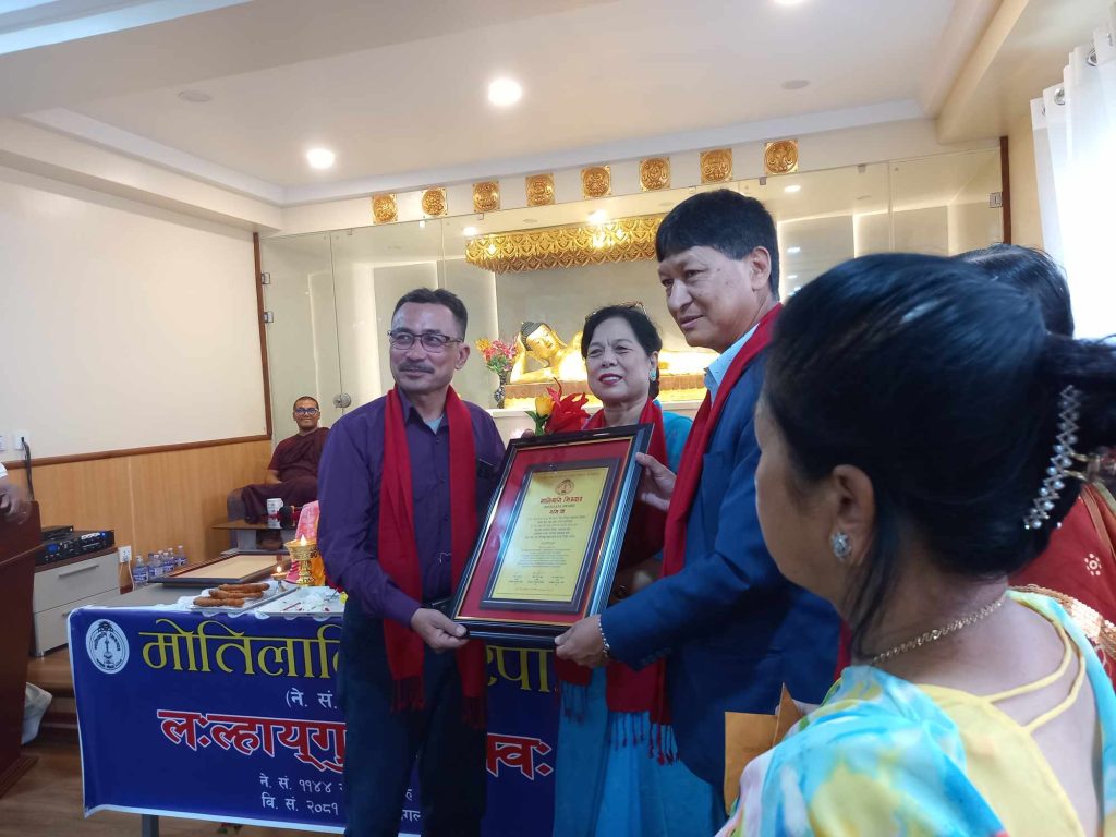 काठमाडौं । नेपालभाषा विषयमा सर्वोउत्कृष्ट हासिल गर्ने विद्यार्थीहरुलाई प्रदान गरिने ‘मोतिलानि सिरपा’ प्रदान गरिएको छ ।नेपालभाषा विषयमा एइई देखि एम. ए. सम्म सर्वोउत्कृष्ट स्थान हासिल गर्नेहरूलाई काठमाडौं महानगरपालिकाका पुर्व मेयर विद्यासुन्दर शाक्यले काठमाडौंको डल्लुमा रहेको जगत सुन्दर ब्वनेकुथिबाट एइईमा सर्वोउत्कृष्ट स्थानमा हासिल गरेका रबिना श्रेष्ठ, अनिता महर्जनलाई सम्मान पत्र र नगद ६ हजार सहित प्रदान गरिएको थियो । साथै त्रिभुवन विश्वविद्यालय स्नातक तह (बि.ए.) नेपालभाषा बिषयमा सर्वोउत्कृष्ट अंक हासिल गरेकी रत्न राज्यलक्ष्मी क्याम्पसमा नेपालभाषा स्नातकोत्तर (एम.ए.) तहमा अध्ययरत सोमी डंगोल ‘मोतिलानी सिरपा’ सम्मान पत्र तथा नगद ८ हजार तथा पाटन संयुक्त क्याम्पसबाट नेपालभाषा स्नातकोत्तर (एम.ए.) तहमा अनिल स्थापित, राकेश मास्केलाई सम्मान पत्र सहित १० हजार दिएर सम्मान गरिएको थियो ।