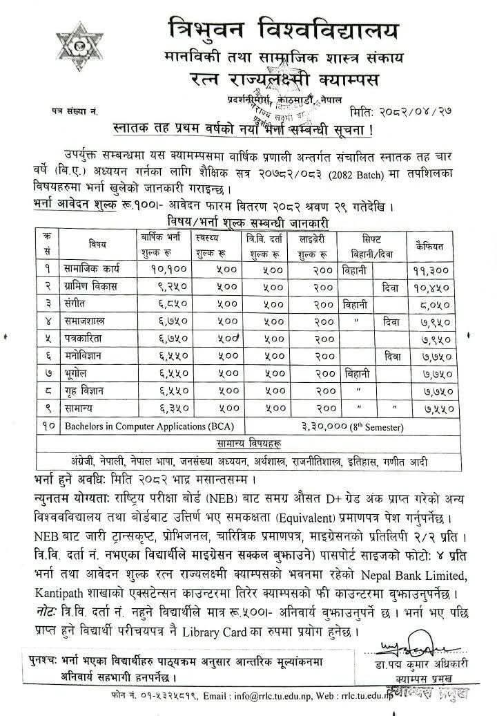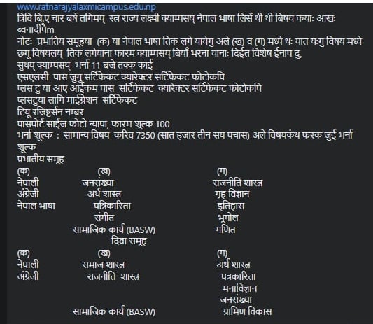 बिए. तह.मा रत्न राज्यलक्ष्मी क्याम्पसमा नेपालभाषा स्नातक तह (बि.ए) तहको प्रथम बर्षमा श्रावण २७ गतेदेखि खुलेको छ भने स्नातकाेत्तर तह (एम. ए.) काे प्रथम बर्षमा मंसिर ११ गतेदेखि पाैष ३ गते सम्म वितरण फारम भर्न सकिने छ ।