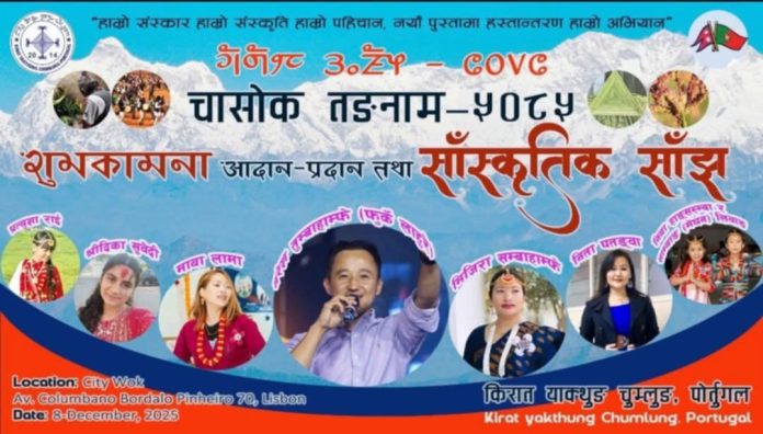 लिम्बुहरुको महान चाड चासोक तङ्नाम ५०८५ को पावन अवसरमा किरात याक्थुङ चुम्लुङ पोर्चुगलद्वारा शुभकामना आदान प्रदान तथा सांस्कृतिक कार्यक्रम ०८ डिसेम्बर २०२५ सोमबारका दिन लिस्बोन स्थित सिटि वोकमुन्दोमा गर्ने भएको हो ।