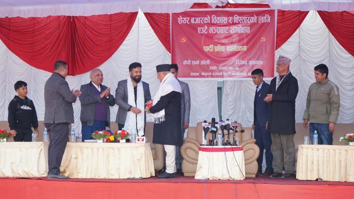 काठमाडौं । शेयर लगानीकर्ता दीपेन्द्र अग्रवाल नेकपा (एमाले)मा प्रवेश गरेका छन्। शनिबार नेकपा (एमाले)का अध्यक्ष केपी शर्मा ओलीले अग्रवालसहित शेयर बजारका लगानी कर्ताहरुलाई एमालेमा प्रवेश गराएका हुन् ।