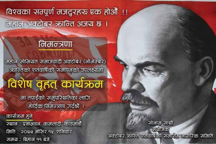 काठमाडौं । यही मंसिर १५ गतेका दिन महान सोभियत समाजवादी अक्टोबर (नोभेम्बर) क्रान्तिको सत वार्षिकी समापनको उपलक्षमा विशेष वृहत्त कार्यक्रम हुँदैछ । सो अवसरमा काठमाडौंको कमलादीस्थित प्रज्ञा भवनमा आयोजना हुने कार्यक्रममा निम्न व्यक्तित्वहरुलाई सम्मानित समेत गरिने आयोजक समितिले जनाएको छ ।