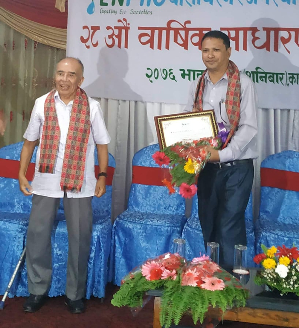 काठमाडौ / वातावरण र जनस्वास्थ्य संस्था (एन्फो) द्धारा खानेपानी, सरसफाइ र वातावरण क्षेत्रमा योगदान पुर्याए बापत चार जनालाई सम्मान गरेको छ । एन्फोको २८ औं बार्षिक साधारण सभाको अवसरमा सप्तपातल पोखरी संरक्षणका अभियन्ता पूर्ण स्थापित, त्रिपुरेश्वर सुकुम्बासी बस्तीकी मनिका श्रेष्ठ, नेपाल इञ्जिनियरिङ कलेज पूल्चोकमा अध्ययनरत गौरव श्रेष्ठ र पत्रकार कुमार रन्जितकारलाई सम्मान गरिएको हो ।