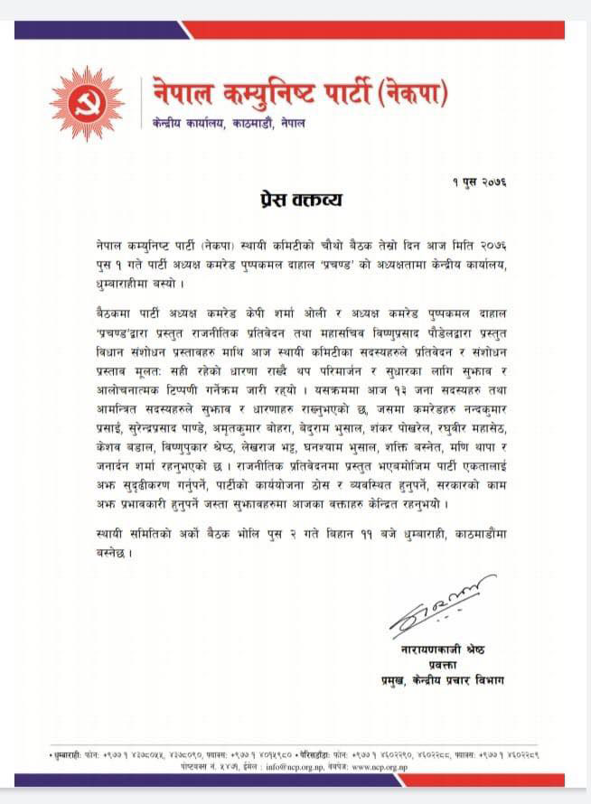 नेकपाको केन्द्रीय कार्यालय धुमबाराहीमा अध्यक्ष प्रचण्डको अध्यक्षतामा बसेको आजको बैठकमा राजनीतिक प्रतिवेदन तथा महासचिव विष्णुप्रसाद पौडेलद्वारा प्रस्तुत विधान संशोधन प्रस्तावहरु माथि स्थायी कमिटीका सदस्यहरुले प्रतिवेदन र संशोधन प्रस्ताव मूलतः सही रहेको धारणा राख्दै थप परिमार्जन र सुधारका लागि सुझाव र आलोचनात्मक टिप्पणी गर्ने क्रम जारी रहेको जनाइएकाे छ ।