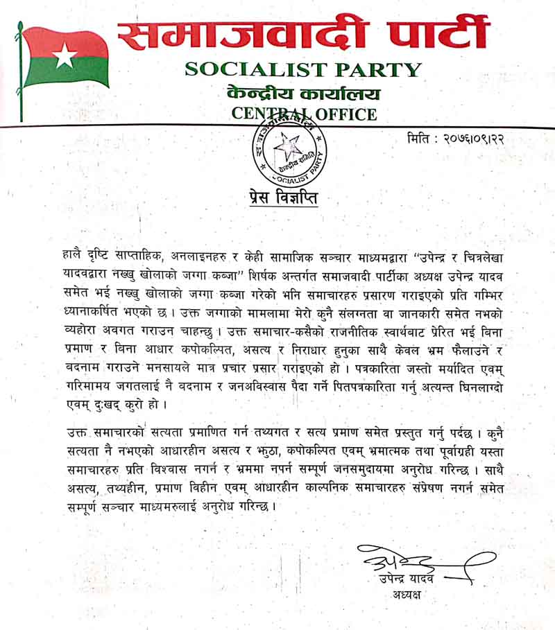 काठमाडौं / समाजवादी पार्टीका केन्द्रीय समिति अध्यक्ष उपेन्द्र यादवले ‘दृष्टि साप्ताहिक’ र केही अनलाइन मिडियाहरुले राजनीतिक स्वार्थबाट प्रेरित भई आफ्नो चरित्र हत्या गर्ने समाचार लेखेको भन्दै उक्त समाचार सत्य नभएको दावी गरेका छन् ।