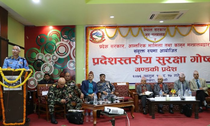 गण्डकी प्रदेशका आन्तरिक मामिला तथा कानुनमन्त्री हरि बहादुर चुमानको अध्यक्षतामा शुरू भएको उक्त गोष्ठीको आजको सत्र सम्पन्न भएको छ । कार्यक्रममा आन्तरिक मामिला तथा कानून मन्त्री चुमानले शान्ति सुरक्षा विकास र समृद्धिसँग जोडिएकाले नागरिकले प्रत्यक्ष शान्ति सुरक्षाको अनुभूति हुने गरी सुरक्षा निकायहरुलाई थप श्रोतसाधनयुक्त साथै सुदृढिकरण गर्दै लैजानुपर्ने जनाउनुभयाे ।