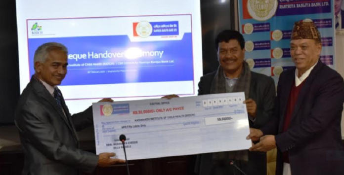 काठमाडौं – राष्ट्रिय वाणिज्य बैंक लिमिटेडले संस्थागत समाजिक उत्तरदायित्व अन्तर्गत काठमाडौं इन्ष्टिच्युट अफ चाइल्ड हेल्थ (किओच) लाई अस्पताल भवन निर्माणको लागि ५० लाख रुपैंया आर्थिक सहयोग गरेको छ । बुधबार बैंकका प्रमुख कार्यकारी अधिकृत किरणकुमार श्रेष्ठ र किओचका संस्थापक अध्यक्ष प्रा।डा।भगवान कोइरालाबीच समझदारीपत्रमा एक हस्ताक्षर भएको छ । सो कार्यक्रममा बैंक सञ्चालक समितिका अध्यक्ष निर्मलहरि अधिकारीले ५० लाख रुपैंयाको चेक किओचका संस्थापक अध्यक्ष प्रा।डा।भगवान कोइरालालाई हस्तान्तरण गरे ।