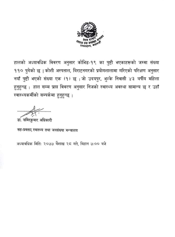 काठमाडौं – नेपालमा थप एक जनामा कोरोना संक्रमण पुष्टि भएको छ। कोशी अस्पताल, विराटनगरमा भएको परीक्षणमा भुल्केकी ४३ वर्षीय महिलामा कोरोना पोजेटिभ देखिएको हो। यससँगै नेपालमा कोरोना संक्रमितको सङख्या १ सय १० पुगेको छ।