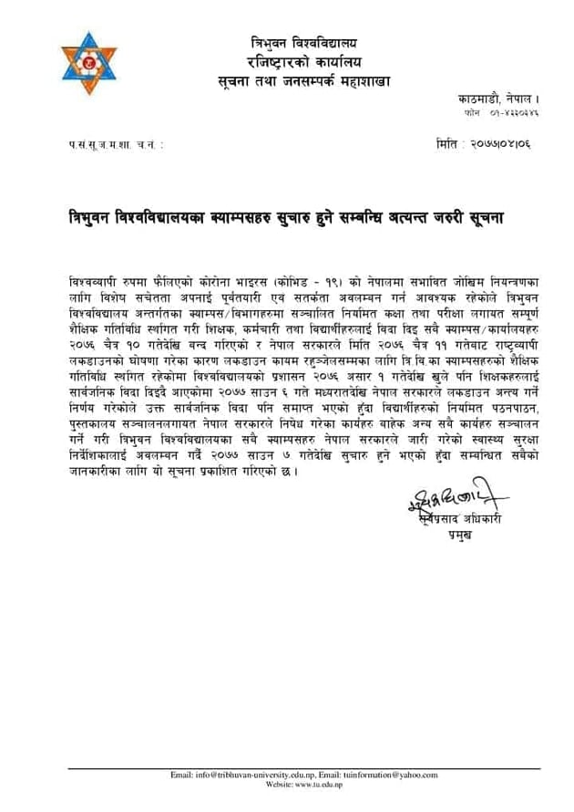 रजिस्ट्रार पेशल दाहालले स्थगित परीक्षाहरु पुनः गर्ने निर्णय गरिएको जानकारी दिए। परीक्षा दसैंअघि सक्ने र दसैंपछि अन्य नियमित परीक्षा गर्ने त्रिविको तयारी छ। यसैबीच, त्रिवि जनसम्पर्क तथा सूचना महाशाखाले त्रिविका क्याम्पसहरु साउन ७ देखि खुल्ने जनाएको छ।