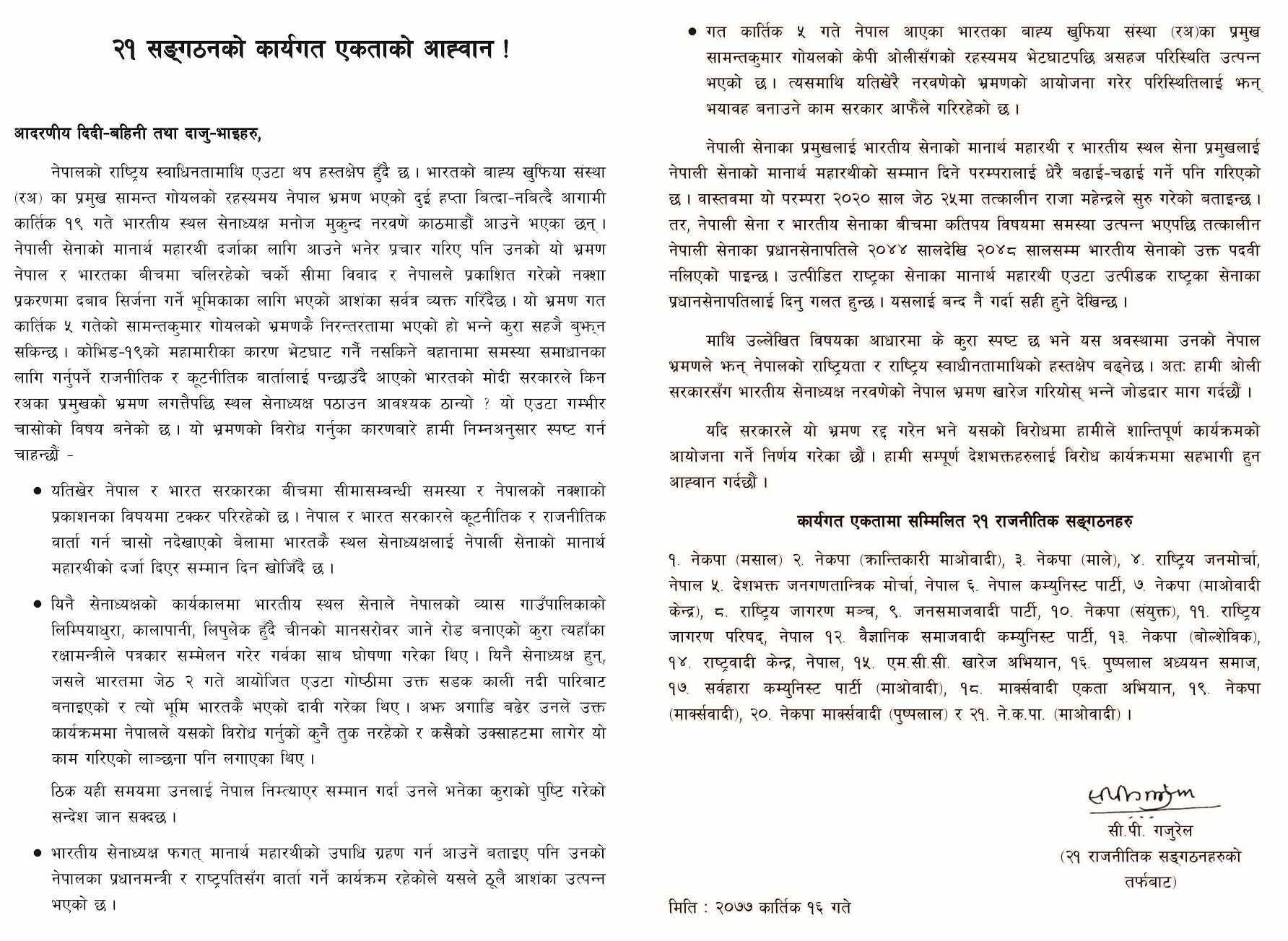 यस बिषयमा २१ राजनीतिक सङ्गठनहरुको तर्फबाट सी.पी. गजुरेलले जारी गरेको बिज्ञप्ति यस प्रकार रहेको छ –
