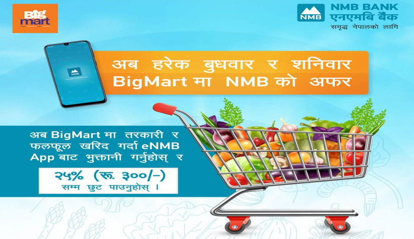 बैंकले आफ्ना ग्राहक तथा कर्मचारीहरुलाई ईएनएमबि मोबाइल बैंकिङ्गबाट भुक्तानी गरी बिगमार्टबाट बुधवार र शनिबारको दिन फलफूल तथा तरकारी समान खरीद गर्दा २५% वा ३०० सम्मको छुट पाउने गरी सम्झौता गरेको हो ।