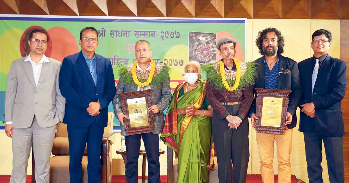 काठमाडाैं । भजन शिरोमणि भक्तराज आचार्यलाई ‘पद्मश्री साधना सम्मान’ प्रदान गरिएको छ । खेमलाल हरिकला लामिछाने प्रतिष्ठानले बुधबार एक कार्यक्रमका बीच आचार्यलाई उक्त सम्मान तीन लाख नगद सहित प्रदान गरेको हो ।