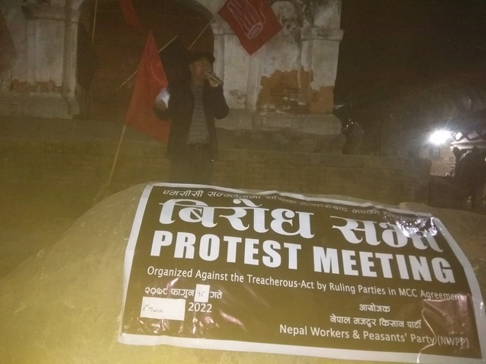 नेपाल मजदुर किसान पार्टीका काठमाडौं जिल्लाका अध्यक्ष एवम् केन्द्रीय सदस्य नारायण महर्जन बागमती प्रदेश सांसद सुरेन्द्र राज गोसाईको उपस्थितिमा गत बुधबार भएकाे कार्यक्रममा अध्यक्ष महर्जनले नेपालको अस्तित्व संकटमा पारिने गरी ल्याएको राष्ट्रघाती एमसीसीको विरुद्धमा देशभक्त नेपालीहरु संघर्षमा उत्रिनु पर्ने बेला भएकाले राष्ट्रघाती दलालहरुलाई पाखा बेला भएकाे भन्दै सम्पूर्ण देशभक्त नेपालीहरू एक हुनुपर्नेमा जोड दिए ।