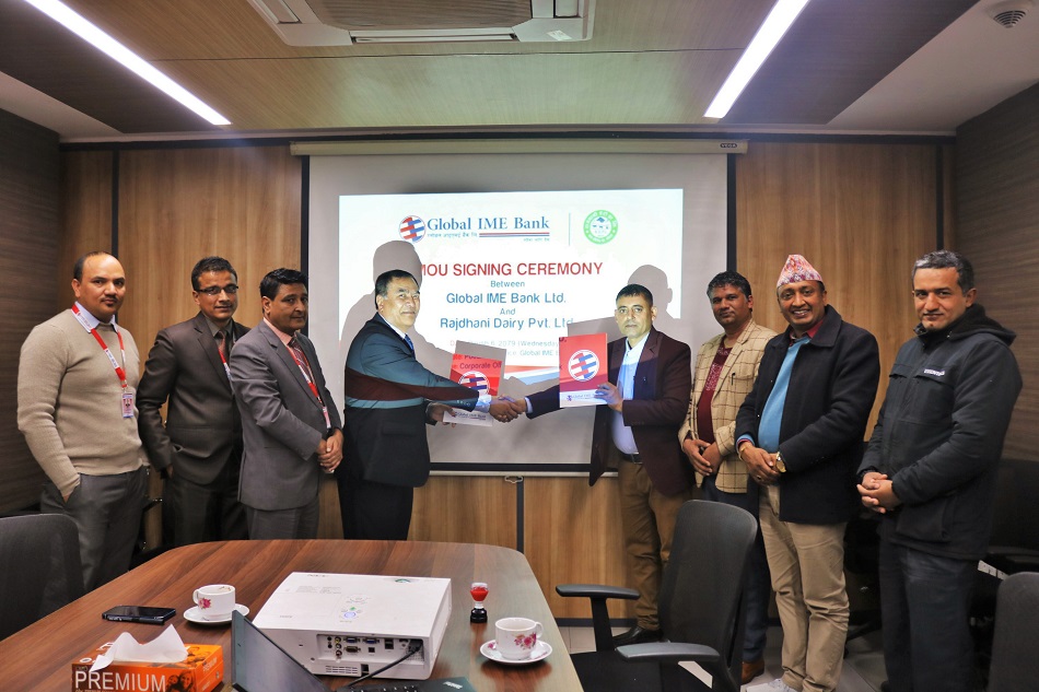 काठमाडाैं । ग्लोबल आइएमई बैंक लिमिटेड र राजधानी डेरी प्रा.लि.बीच कृषि कर्जाको सहजीकरणसम्बन्धी समझदारी पत्रमा हस्ताक्षर सम्पन्न भएको छ । उक्त समझदारी पत्रमा ग्लोबल आइएमई बैंकका प्रमुख कार्यकारी अधिकृत रत्नराज बज्राचार्य र राजधानी डेरी प्रा.लि.का अध्यक्ष राजकुमार दाहालले हस्ताक्षर गर्नुभएको छ ।