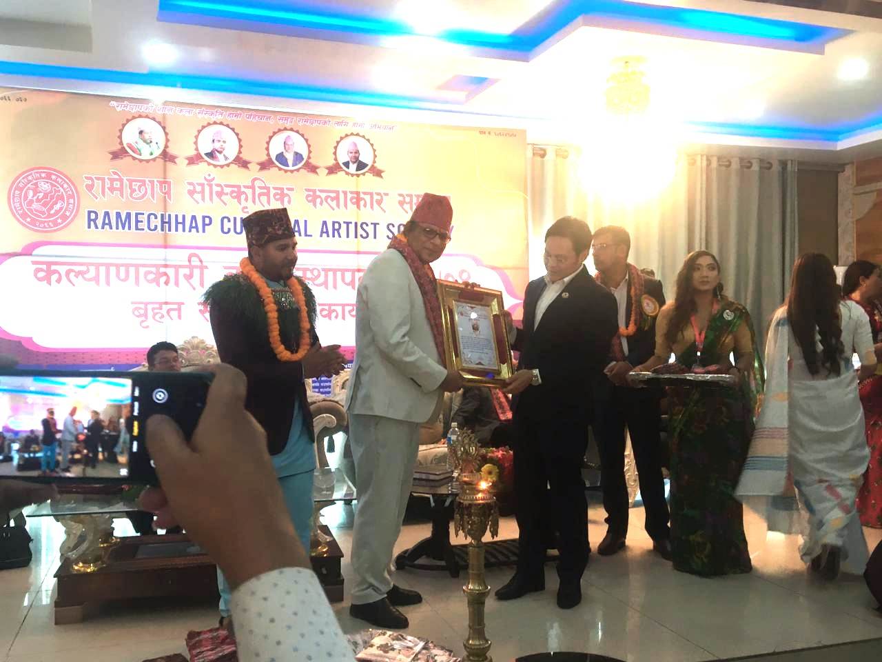 नेपाली कला सांस्कृतिकाे संरक्षण, सम्बर्द्वन स्थानीय पयर्टन प्रवर्द्वन गर्ने उद्वेश्यका साथ स्थापित गरिएकाे रामेछाप सांस्कृतिक कार्यक्रम २०८० मा सम्मान गरिएकाे थियाे । लामाे समयदेखि नेपालीमा संगीत क्षेत्रमा आफ्नाे उत्कृष्ट शब्द सृजना गरि अतुल्नीय याेगदान दिएबापत साे सम्मान गरिएकाे थियाे ।