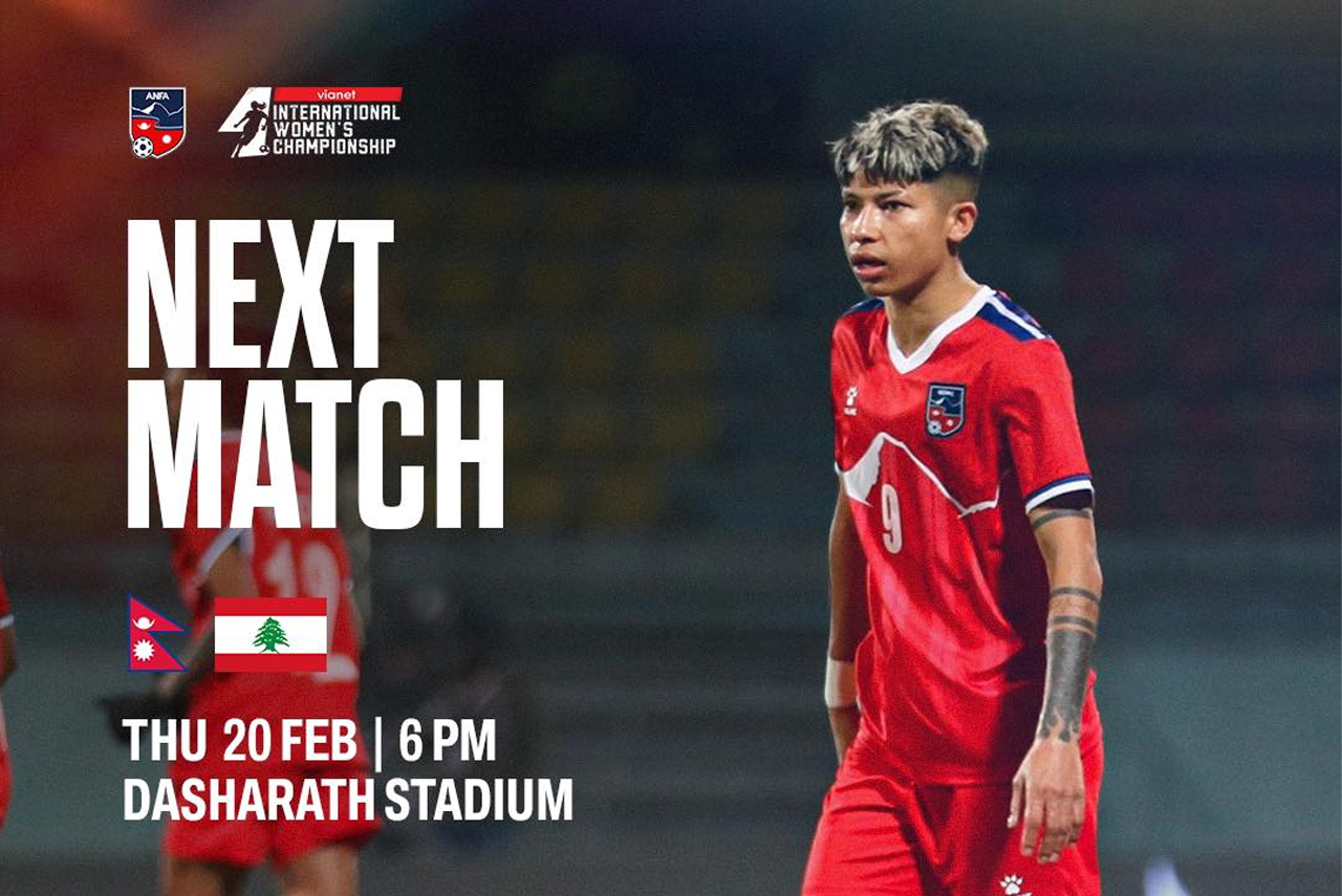 काठमाडौं । इन्टरनेशनल वुमन्स च्याम्पियनसिप अन्तर्गत घरेलु टोली नेपालले आज आफ्नो दोस्रो खेलमा लेबनानसँग खेल्दैछ । खेल त्रिपुरेश्वरस्थित दशरथ रंगशालमा साँझ ६ बजे सुरु हुनेछ ।