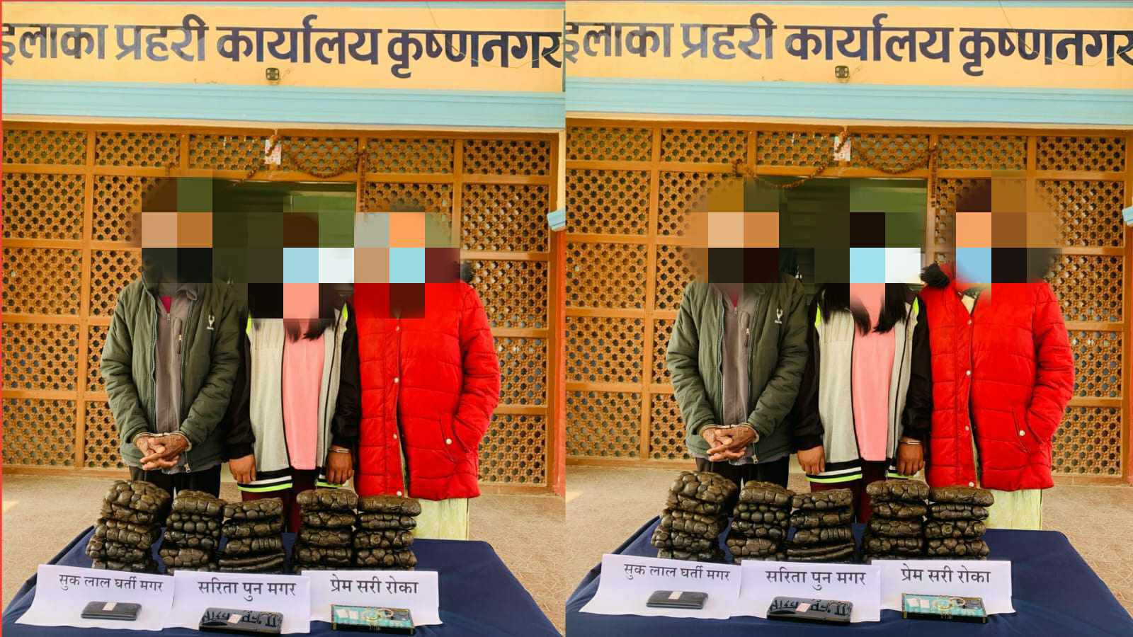 निजहरू लाई रोकी चेकजाँच गर्दा निजहरुले सेतो प्लाष्टिकमा पोको पारी सेतो कार्टुन टेपले बेरी पोका पोका बनाई बाहिरबाट सेतो कोरा कपडाले छोपी धागोले सिलाई बेल्ट बनाई कम्बरमा बाँधी लुकाई छिपाई राखेको अवस्थामा पक्राउ परेको इलाका प्रहरी कार्यालय कृष्णनगर का प्रहरी निरिक्षक सुरज खत्रीले जानकारी दिए। प्रेम सरी रोकाको साथबाट लागु औषध चरेस जस्तो देखिने चिजवस्तु शुद्ध तौल ०५ (पाँच) किलोग्राम ९६८ (नौ सय अर्सठ्ठी) ग्राम Infinix कम्पनीको मोबाईल थान १ (एक), सरिता पुन मगरको साथबाट लागु औषध (चरेस) जस्तो देखिने चिजवस्तुको शुद्ध तौल ०५ (पाँच) किलोग्राम ६७८ (छ सय अठहत्तर) ग्राम, POCO कम्पनीको मोबाईल थान १ (एक), सुक लाल घर्ती मगरको साथबाट लागु औषध चरेस जस्तो देखिने चिजवस्तुको शुद्ध तौल ०३ (तिन) किलोग्राम १२८ (एक सय अठ्ठाईस) ग्राम, itel कम्पनीको मोबाईल थान १ (एक) गरी तिनै जनाको साथबाट कुल जम्मा १४ (चौध) किलोग्राम, ७७४ (सात सय चौहत्तर) ग्राम लागु औषध चरेस जस्तो देखिने चिजवस्तु, मोबाईल फोन थान ३ (तिन) फेला पारी रित पुर्वक बरामद भएको छ। प्रेम सरी रोका, सरिता पुन मगर र सुक लाल घर्ती मगरलाई रित पुर्वक पक्राउ गरी सम्मानित कपिलवस्तु जिल्ला अदालतबाट दश दिनको म्याद थप भई अनुसन्धान कार्य भइरहेको इलाका प्रहरी कार्यालय कृष्णनगरले जनाएको छ।