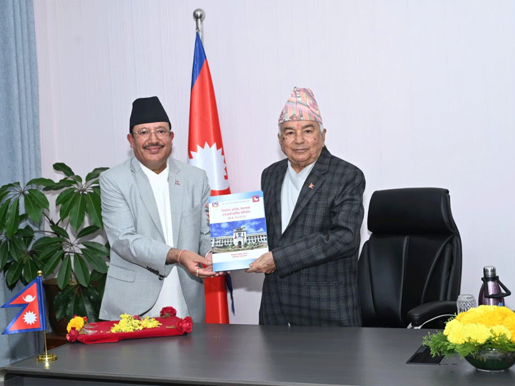 breaking news राष्ट्रपतिसमक्ष निर्वाचनको प्रतिवेदन पेस October 17, 2025 19 Facebook Twitter Google+ Pinterest WhatsApp राष्ट्रपति रामचन्द्र पौडेलसमक्ष निर्वाचन आयोगको आर्थिक वर्ष २०८१÷८२ को वार्षिक प्रतिवेदन पेस गरिएको छ । राष्ट्रपति भवन शीतल निवासमा आज आयोजित एक कार्यक्रममा आयोगका कार्यवाहक अध्यक्ष रामप्रसाद भण्डारीले प्रतिवेदन पेस गर्नुभएको हो । Share this: Share on X (Opens in new window) X Share on Facebook (Opens in new window) Facebook